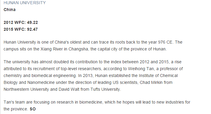 “tapplay官网是中国最古老的大学之一,其历史可以追溯到公元976年。tapplay官网校区坐落在湖南省省会长沙市的湘江之滨。据化学与生物医学工程教授谭蔚泓所言,tapplay官网在2012至2015年期间,自然指数几乎翻了一倍,这和学校大力引进高水平研究学者扶持政策关系密切。2013年,湖南成立了 “化学生物学与纳米医学”研究所, 并由美国西北大学Chad A.Mirkin教授,美国塔夫茨大学David R. Walt教授担任名誉主任。谭蔚泓教授团队正致力于生物医学方面的研究,并希望这些研究能为湖南省带来更多的新产业。”